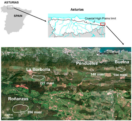 The mires considered in this study are located in Asturias (North Spain), in the coastal high plains, which are thought to be erosion surfaces representing ancient coastlines [34]. The studied sites are Roñanzas (UTM 30 T; 365083; 4803428), La Borbolla (UTM 30 T 365314 4803546), Pendueles (UTM 30 T 368243 4805879), and Buelna (UTM 30 T 369898 4805333), which are located in an area of around 25 km2 close to the boundary between Asturias and Cantabria. The peat bogs developed over low permeability quartzitic substrates at heights ranging from 134 to 256 m above sea level (masl) in a strictly continental setting (Figure 1). They have limited areal extent (2–9 ha) and depths ranging from 56 to 254 cm. The climate in this region is of the Atlantic type with humid temperate winters and occasional droughts in the summer. The vegetation of the mires is dominated by Sphagnum with some subordinate herbaceous plants and heather [35]. The studied mires correspond to the Erico mackaianae-Sphagnetum papillosi association [36] and are of the Cantabro-Atlantic type, according to the classification proposed by Fernandez Prieto et al. [36] for northern Spain peats. They are characterized by the presence of bryophytes: Sphagnum (S. papillosum and S. tenellum), Odontoschisma sphagni, and Aulacomnium palustre, and plants like Erica mackaiana, Erica ciliaris, Drosera rotundifolia, Molinia caerulea, Potentilla erecta, and Arnica montana subsp. atlantica [37].