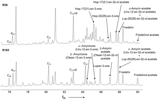 The relative abundance of the various higher plant triterpenoid families and the type of derivative (ketone, acetate) will be presented in this section in order to establish their distribution in the different peat profiles. Compounds belonging to similar families to those identified in the fresh plants were identified in the peat extracts as shown in the higher retention time sections of the total ion current (TIC) chromatograms of selected extracts from Roñanzas (as an example, TIC traces of samples R39 and R163 are shown in Figure 3). The higher plant triterpenoids found in Roñanzas profile are generally functionalized at the C-3 position with ketone or acetyl groups (Table 2). Among these compounds, lupane derivatives are generally the most abundant ones and are represented by lupan-3-one (ranging from 0.5 to 78 µg/g Corg) and lup-20(29)-en-3β-ol acetate (ranging from 0.5 to 127.5 µg/g Corg).