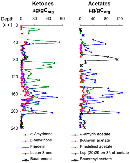 Oleanoids and friedelanoids are represented in the Roñanzas profile by β-amyrenone (0.1 to 27 µg/g Corg), friedelin (0.4 to 84 µg/g Corg), and their acetyl derivatives. The β-amyrin acetate concentrations (0.3 to 43 µg/g Corg) are nearly twice as large as those of β-amyrenone (Table 2), whereas the opposite occurs for friedelanyl acetate throughout most of the profile (0.2 to 42 µg/g Corg). Contrarily to the fresh plants, the oleanane-derivatives predominate over ursane-derivatives in Roñanzas peat (Table 1 and Table 2), a characteristic known to be shared by other bogs and fens in the region [21,22,23,50].