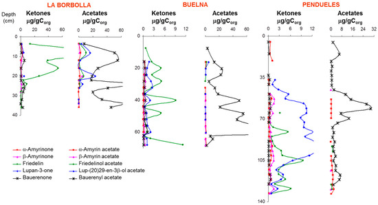 Variation of the concentration of higher plant triterpenoid ketones and acetates in the Buelna, La Borbolla, and Pendueles profiles (µg/g Corg).
