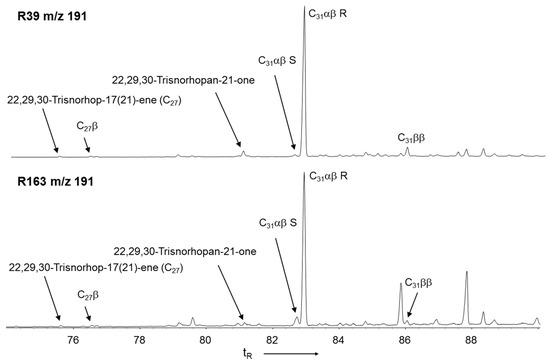 The m/z 191 mass chromatograms for samples R39 and R163 are shown in Figure 6, where regular hopanes from C27 to C31 (except C28) can be appreciated corresponding to the α and β configurations at positions C-17 and C-21, respectively. The most prominent peak of the regular hopanes is the homopane C31αβ R (Figure 6).