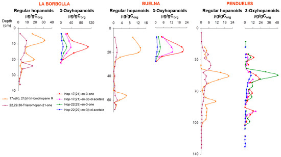 Variation of the concentration of regular and 3-oxyhopanoid derivatives in the Buelna, La Borbolla, and Pendueles profiles (µg/g Corg).