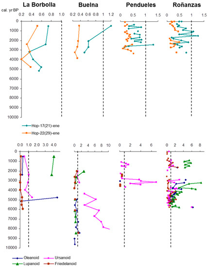 Similar higher plant triterpenoids to those quantified in Roñanzas are also quantified in the Buelna, La Borbolla, and Pendueles profiles. Both the oleanane and ursane derivatives generally tend to concentrate at specific intervals in the different profiles (Figure 5), whereas the bauerane, lupane, and friedelane derivatives exhibit different concentration patterns. The concentration of friedelin in La Borbolla (0.3 to 114 µg/g Corg) is significantly higher than that of the other ketones (0.1 to 6 µg/g Corg). The differences are smaller in Buelna (0.5–11.2 vs. <2.6 µg/g Corg), where also lupan-3-one show higher concentrations than both α- and β-amyrenone (Table 3). In the Pendueles profile, both lupan-3-one and friedelin have uneven concentration patterns and predominate over other ketones, the former being the most abundant one. Lupenol acetate could not be quantified in this profile due to its co-elution with hop-17(21)-en-3β-ol acetate. Bauerenyl acetate is present throughout the Buelna, La Borbolla, and Pendueles profiles in significant concentrations (Table 3), whereas in Roñanzas it is restricted to specific intervals. Common features to all the profiles are that friedelin and lupan-3-one are generally more abundant than α-amyrenone and β-amyrenone, and that oleanoid concentrations are slightly higher than those of ursanoids (Table 3, Figure 5). Generally, higher plant triterpenoid concentrations are lower in the Buelna and Pendueles profiles and higher in the Roñanzas profile (Figure 4 and Figure 5, Table 2 and Table 3).