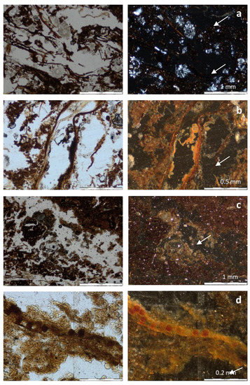 The fabric of both materials is similar: Mainly layered (medium to large organic remains with a subhorizontal orientation referred to the soil surface) and a juxtaposed fine granular structure due to faunal activity. Both materials have an undifferentiated b-fabric due to the masking effect by the organic matter, and the plant residues are phlobaphenized (containing reddish compounds from the oxidation of tannins). The H2 horizon of profile 1 has abundant fan-like arranged prismatic gypsum crystals as pedofeatures (gypsum rosettes), showing the typical prismatic habit of acidic environments [33,34] (Figure 2). It agrees with the positive qualitative reaction to sulfates (Table 1), while in profile 2 it is negative. The origin of gypsum is therefore the oxidation of pyrite-sulfur present in soil and its combination with Ca2+ in the soil solution. The precipitation of gypsum did not buffer all the potential acidity, probably due to the depletion of the Ca2+ source (low Ca2+ availability), since the present pH are strongly acidic, and also because jarosite formed in both profiles (Figure 2). It is found associated with plant rests and also as aggregates, which can be indicative of former pyrite-bearing soils. Indeed, no pyrite framboids have been observed in the horizons, although possible pseudomorphs after pyrite were detected associated with organic remains (Figure 2d). Therefore, we think that the oxidation of fine primary pyrite contained in the Cambro-Ordovician parent material, not observable in thin sections, could be the main cause of the existence of sulfidic materials [34]. The H horizon of profile 2 shows almost no gypsum.