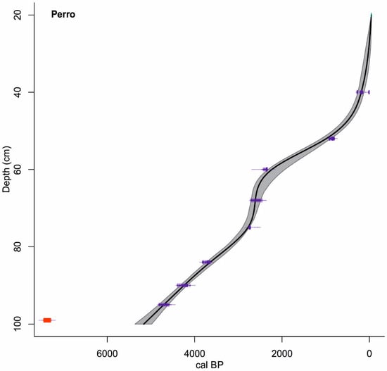 A 100 cm long peat core was collected using a Russian peat corer (50 cm long and 5 cm in diameter). Peat sections were placed in PVC (polyvinyl chloride) tubes and properly stored under dark and cold conditions (4 °C). The core was sub sampled into contiguous 1 cm thick portions. Ten bulk peat samples were 14C dated at the radiocarbon laboratories of Poznán (Poznán, Poland) and Angstrom Laboratory of Uppsala University (Sweden) using the Acelerator mass spectrometry (AMS) technique (Table 1). The dates were calibrated using CALIB 7.1 with the IntCal13 curve [37]. Samples younger than 1950 were treated according to Hua and Barbetti [38]. An age-depth model was produced using the R package “clam” running in R.3.2.2 [39,40]. The best fit was obtained applying a smoothing spline to the available radiocarbon dates (Figure 2). Confidence intervals of the calibrations and the age-depth model were calculated at 95% (2σ) with 1000 iterations.