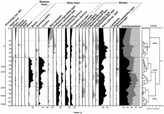 Pollen zone PRR2 extends through almost 40 of the central core’s centimetres (80–43 cm; approximately 3205–270 cal. BP). From a cultural point of view, this stretches from the end of the Bronze Age (4150–2800 cal. BP) to the Modern Age (approximately 500–150 cal. BP). This pollen zone can be also divided into two pollen sub-zones: PRR2A (80–63 cm; 3205–2480 cal. BP) and PRR2B (63–43 cm, 2480–270 cal. BP). PRR2A shows an evident increase in Corylus and Betula percentages, as the latter are more present in the landscape (21.3% and 22.9%, respectively). It is possible to note an increase in riparian trees (Alnus, Fraxinus, Populus, Salix) and also an evident decreasing trend in Pinus sylvestris type: its maximum in this period corresponds to 19.9% but it this decreases to 11.1% in the end of the pollen subzone. Instead, Pinus pinaster progressively increases. Quercus trends are also descending, and their percentages, (both evergreen and deciduous Quercus) oscillates between 2–6%. There is more shrub variety (Arbutus unedo, 1.7%; Helianthemum, 1.5%, Cytisus/Genista, 4.1%). Myrica gale sharply appears in the 75 cm sample at 11.7%, but it is possible to assess a decreasing dynamic in Cyperaceae (3.7–0%). PRR2B shows the opposite relationship between Corylus and Betula, with the former being dominant (34% vs. >23% for Betula). The percentages of pines are reduced sharply to negligible values, while both evergreen and deciduous Quercus show an increasing but discrete trend (deciduous Quercus increases from 1.3% to 8.1%). Shrubs are still very present in the landscape but they follow an opposite trend to Corylus and Betula, which is visible in Erica arborea dynamics (maximum 24.4%). Herbs are dominant in the landscape but they show a very irregular trend, which is especially evident in Poaceae percentages (37.9%). Myrica gale decreases abruptly (18.5–10.3%) and Erica tetralix and Pteridium aquilinum spread (10–7% and 5.2–20%, respectively). Humid indicators (Filicales monolete, Cyperaceae, HdV-18) show an evident increasing trend.
