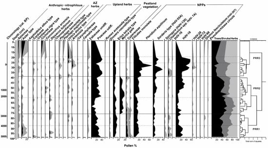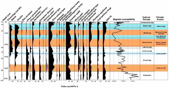 The first pollen zone PRR1 comprises the basal 20 cm of the sequence (100–80 cm; approximately 5200–3200 cal. BP). This pollen zone can be divided into two different sub-zones. PRR1A includes samples from 100 to 89 cm (approximately 5200–4150 cal. BP) and PRR1B encompasses from 89 to 80 cm (approximately 4150–3200 cal. BP). From a cultural point of view, PPR1 belongs to the regional Chalcolithic period (approximately 5250–4200 cal. BP) and part of the Bronze Age (approximately 4150–2800 cal. BP). PRR1A shows a wide Quercus population, as deciduous species are better represented with percentages around 15–20%. Otherwise, evergreen Quercus shows a slight descending trend (13–9.3%). Besides, Pinus sylvestris type also shows notable percentages (>10%), but its values are not enough to consider the possibility of local pinewood but regional pollen deposition [68]. Between the arboreal layer, it is possible to distinguish Betula and Corylus (2.6% and 6.4%, respectively). Taking advantage of the trees decreasing dynamic, shrubs, dominated by Erica arborea type, progressively increased (10.8–29.9%). Herbs also show a similar behavior, with Poaceae the best represented (29.7%). It is necessary to mention the constant but discrete presence of anthropic–nitrophilous (Apiaceae, Aster, Asphodelus albus, Cardueae, Centaurea nigra, Cichorieae, Convolvulus arvensis, Dipsacus fullonum) and anthropozoogenous herbs (Chenopodiaceae, Plantago lanceolata, Plantago major/media, Urtica dioica), indicating, along with coprophilous fungi (Chaetomium, Sordaria, Sporormiella), human exploitation of this environment. Erica tetralix also shows an increasing trend, as do Pteridium aquilinum (4.9–12.7% and 6.1–17%, respectively); meanwhile, Cyperaceae and Drosera progressively decrease (8.3–5%). HdV-18 is represented by relatively high values through the zone (15–20%). PRR1B is also dominated by trees, which show an initial decrease (<40%) followed by an increase (approximately 45%) and another subsequent detriment (30%). Corylus and Betula reappear again; meanwhile Quercus (both evergreen and deciduous morphotypes) show a descending trend (11.1–10.6% and 10.5–3.3%, respectively). Erica arborea type follows a contrary pattern to that of trees. Helianthemum, Calluna vulgaris and Artemisia show an increasing trend, while HdV-18, the above mentioned anthropic–nitrophilous herbs and coprophilous fungi show a decreasing pattern.