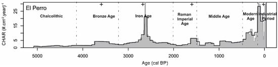 However, despite the climatic influence in the abovementioned changes, there was already an intense anthropic intervention in the landscape. During this period, intense demographic growth translated into a heavier exploitation of the natural resources. This is visible in the El Perro pollen diagram (Figure 3, Figure 4 and Figure 6) where the anthropic markers show an increasing trend, but also in the abovementioned El Brezoso mire [31]. Those changes, on the other hand, were also related to policies promoted in the first part of the Contemporary Age. Confiscation laws were promoted in an attempt to change the property of many of the lands and triggering the exploitation of these mountainous lands [28,30,107,108]. Fire became the most important tool for this new management strategy as shown by the increasing CHAR values and fire frequency (Figure 5). Olea cultivation in the region left a notable imprint in the mire pollen reconstruction (Figure 3 and Figure 6).