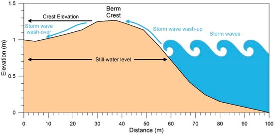 Crest elevations of the shorelines measured along the Tobar transect likely do not correspond directly with the elevation of the water surface at the time when the lake was constructed. These shorelines consist of coarse sand and gravel and were presumably built by large waves driven by storms sweeping across the former lake surface. Observations of the modern Great Salt Lake in Utah have demonstrated that wave run-up can construct beach berms at elevations up to 2 m higher than the still-water surface of the lake [17,18]. Thus, the elevations of the Lake Clover berms mapped and sampled in the field must be adjusted downward to correspond with the former lake surface elevation. Consideration of the measured topographic profile crossing each ridge supported an estimation of the midpoint elevation of the beach face; this was taken as the still-water level on the beach face at the time when each berm was built (Figure 4). These elevations were used in a GIS to determine the dimensions of Lake Clover when each shoreline was produced.