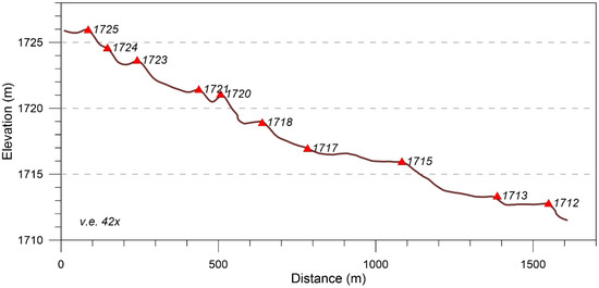 Aerial photography and field reconnaissance confirm the presence of 10 shorelines built by Lake Clover at the Tobar transect. Topographic surveying with the total station, combined with the vertical adjustment detailed in Figure 4, indicates that shorelines were built when Lake Clover stood at elevations of 1725, 1724, 1723, 1721, 1720, 1718, 1717, 1715, 1713, and 1712 m (Figure 5).