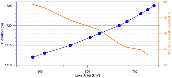 Reconstructed hypsometry of Lake Clover. The area of the lake ranged from 740 km2 at the highstand, to 485 km2 when the lowest shoreline was constructed (blue). The rate of change from one shoreline to the next increases at lower elevations (orange).