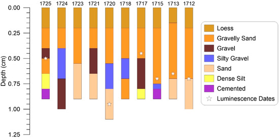 Stratigraphically, the unconsolidated sediments forming these ridges are arranged in layers from 5 to 20 cm thick (Figure 9). Lenses of gravel poor/sand dominant sediment are locally present. At the scale of the hand excavations, it was not possible to determine whether the layers deviate from horizontal. The coarser gravel layers are faintly imbricated. A layer of relatively gravel-poor silt from 15 to 20 cm thick interpreted as loess caps each shoreline. Beneath this silt in all shorelines is a layer of gravelly sand 25 to 55 cm thick. In some excavations, this gravelly sand locally transitions to a finer silty gravel at depth. These basic types of sediment are present in all of the described exposures (Figure 10). However, in the lowest three shorelines, the loess layer is less distinct and gravelly sand makes up a greater proportion of the stratigraphy (Figure 10). Some excavations encountered a matrix-poor, openwork layer of fine gravel at depth that readily caved into the pit, making deeper excavation difficult. Other excavations reached a dense silt layer at a depth of 80–120 cm that similarly halted further penetration. The pits at 1721, 1720, 1713, and 1712 reached a nearly pure sand layer >65 cm below the surface. The excavations in the 1725, 1723, and 1715 shorelines reached a carbonate cemented layer. This horizon forms the floor of alluvial gully along the railroad tracks near the exposure through the 1715 ridge.