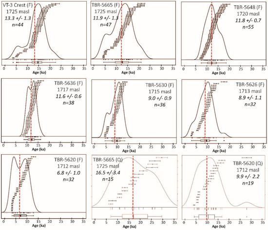 Further confidence in the luminescence results is provided by a sample collected from the highstand shoreline at Ventosa in the south-central part of the area covered by Lake Clover (“V” in Figure 1). This sample, from a depth of 80 cm below the ridge crest, yielded a feldspar pIRIR SAR age of 17.6 ± 1.9 ka. This result overlaps with the age for the highstand shoreline at Tobar (K-feldspar 15.9 ± 1.9 ka, quartz 16.5 ± 3.4 ka) and exhibits strong consistency with two 14C ages (~17 to 17.5 cal ka BP) from same depth (74–85 cm) in the highstand shoreline at a site in the northeast Independence Valley (“I” in Figure 1). Radiocarbon dating of gastropod shells from ~150 cm at Ventosa yielded older ages of ~19 cal ka BP, which nonetheless fall within the distal ranges of the error bars on the pIRIR SAR result (Figure 12). It is possible that Lake Clover reached its highstand elevation twice, first ca. 19 ka, and again ca. 17 ka [14]. Either way, the correspondence between the pIRIR SAR age and the available 14C control is strong confirmation that the luminescence ages are not subject to a systematic bias.