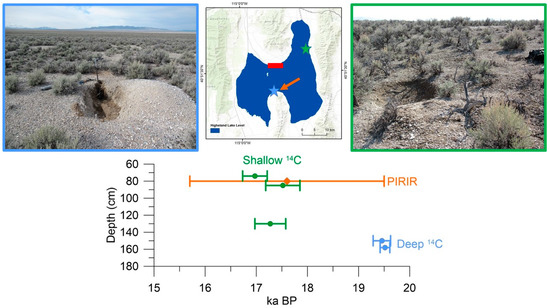 Results of a comparison between pIRIR SAR and calibrated 14C ages for the highstand shoreline of Lake Clover. Gastropod shells were not encountered in the excavations at the Tobar transect (red box); however, shells from deep excavations in the highstand beach ridge at Ventosa (left photo, blue star, “V” in Figure 1, plotted in blue above), and from shallow excavations in the northeast Independence Valley (right photo, green star, “I” in Figure 1, plotted in green above) were successfully dated with 14C [14]. A luminescence sample from Ventosa (orange arrow) from a depth of ~80 cm was dated with pIRIR SAR on K-feldspar (plotted in orange above), yielding an age that matches the calibrated 14C results from the same depth in the highstand shoreline in the northeast Independence Valley. The error bars (2-sigma) on the luminescence result (PIRIR, orange above) also overlap with the 14C results from deeper within the highstand ridge at Ventosa. This correspondence lends confidence in the robustness of the luminescence age results.