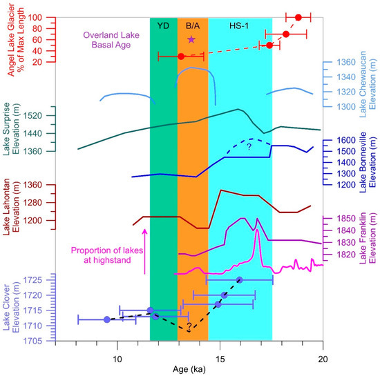 Figure 13 plots the calculated ages for Lake Clover shorelines against the fraction of the highstand lake area covered when each shoreline was constructed. It is clear that the lake reached its highstand during Heinrich Stadial 1 [28,29] (Greenland Stadial GS-2 in the INTIMATE Event Chronology [30]), followed by a regression into the Bølling/Allerød (GI-1). Two of the lower shorelines were built during or at the end of the Younger Dryas episode (GS-1), and the lowest shoreline was constructed in the early Holocene.