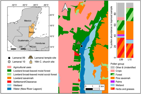 The Central Maya Lowlands, including Belize and the Petén region of Northern Guatemala, has extensive archaeological evidence for the presence of the Maya, with crops synonymous with Maya agriculture. The diversity of past Maya land use is observed in pollen records throughout the northern region of Belize, suggesting forest clearance for field-based agriculture occurring c. 2500 BCE, with evidence of crop production as early as 3400 BCE [32,33,34,35,36,37]. Soil erosion is evident in multiple records across the Central Maya Lowlands, soon after the appearance of crops [38,39,40,41,42,43], with some evidence of terracing [40] and wetland agriculture [37,44] during c. 2000–1000 BCE. Lamanai was an important Maya site. Major phases of occupation at Lamanai are described extensively, with Maya settlement beginning at c. 1500 BCE, persisting until the post-Conquest period [23,24,45,46,47,48,49,50], and even into the modern period [51,52,53] (Table 1).