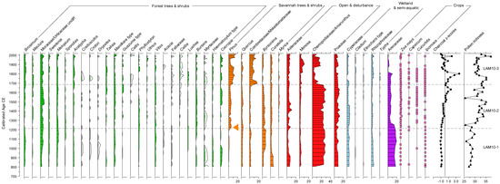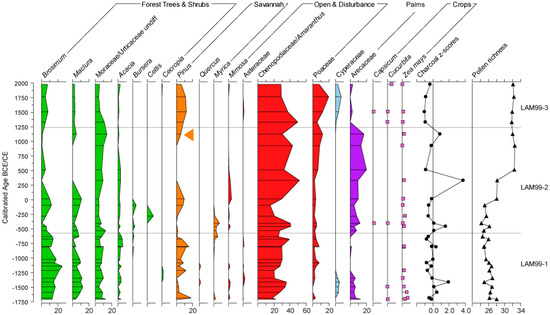 The palynological and charcoal results from this core have been published as a record of vegetation history from Lamanai, NRL for the period 1500 BCE to 1500 CE [19]. Here, we present a summary of the vegetation changes contextualised by the updated age-model that spans 1700 BCE to present (Figure 3). The previous age model was not extrapolated to the surface; the new age model presented here demonstrates that the post-European period is represented by only two horizons in Lamanai-99, thus the previous interpretation is unchanged in that majority of the record represents the pre-European period. The revised age model also highlights the requirement for the new higher resolution record offered here.