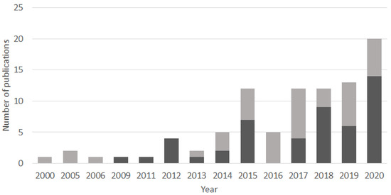 Bar chart showing the number of publications per year from 2000 to 2020 containing at least one of the following terms in the title, the keywords, or the abstract: sedaDNA; sedimentary ancient DNA; sedDNA; sedimentary DNA. The document search was conducted through Scopus on 25 November 2020 and was restricted to journal articles and review articles. The results are split into two categories for visualization: publications that contained the search terms sedaDNA or sedimentary ancient DNA (dark grey bars); and publications that had the search terms sedDNA or sedimentary DNA, but that did not contain the first two terms (pale grey bars).