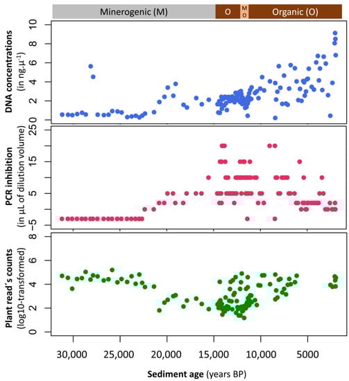 The plot shows three measures of DNA extraction/amplification quality with time on the x-axis (years before present (BP)). The first plot (blue dots) shows the DNA concentration (ng.µL−1) with a moderate to strongly negative correlation with age. The second plot (pink dots) shows the PCR inhibition as the dilution volume (in µL) necessary for qPCR reactions to succeed. Inhibition is absent until ~23,000 years BP and increases steadily afterwards. The third plot (green dots) shows the log10 of the mean number of raw reads from plant DNA metabarcoding. The number of reads is strongly and negatively correlated to the level of inhibition (see Appendix A). A simplified description of sediment lithology is provided at the top of the figure: minerogenic (M), organic (O), and minerogenic–organic (MO) sediment types.