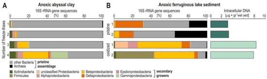 Inadequate handling during coring and subsequent storage of sediment samples can have unexpected consequences such as (i) degradation of DNA by fast-growing bacteria that use nucleic acids as a substrate or due to hydrolysis and oxidation and (ii) modification of the composition of mainly the microbial DNA pool by growth. For instance, even minimal exposure to oxygen results in rapid fungal and bacterial growth. Even storing sediment in well-sealed conditions at 4 °C can clearly affect the reliability of the sedaDNA signal, particularly when studying past microbial diversity with e.g., 16S or 18S rRNA metabarcoding. The 16S rRNA gene amplicon data from the case study A2 (Appendix A) highlight the effect of secondary anaerobic growth on the DNA signal observed from sedimentary archives. In particular, these data show that microbial seed banks can reactivate or alternatively, that new microbes can colonize the sediments shortly after exposure to oxygen (Figure 3). In the two cases reported here, freeze–thaw cycles (Figure 3A) and oxygen diffusion (Figure 3B) increased the proportion of extractable DNA that mainly originated from growth of facultative anaerobic and metabolically versatile Gamma proteobacteria. Therefore, in 16S rRNA amplicon DNA inventories, secondary growth can induce a significant bias in the signal from past and present bacterial communities in the sediment (Figure 3B, Appendix A).
