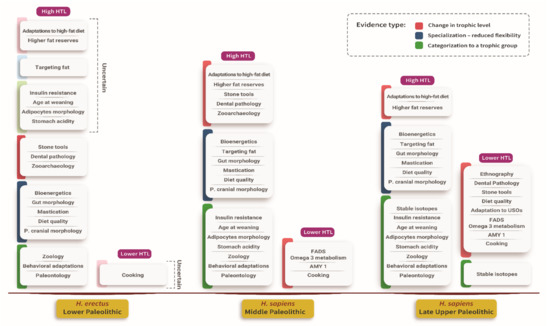 A list of evidence by trophic level, human species, period, and type of evidence. The evidence was divided into three types–1 (red): evidence for a change in the trophic level, 2 (blue): evidence for specialization, and 3 (green): categorization to a trophic group. Uncertain association of an item with H. erectus appears in muted color.