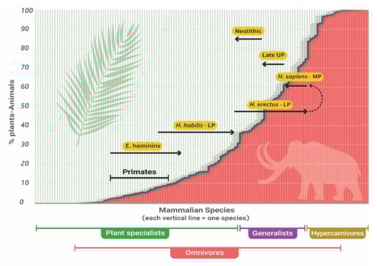 Proposed evolution of the human trophic level during the Pleistocene. LP–Lower Paleolithic; MP–Middle Paleolithic; UP–Upper Paleolithic; E. hominins–Early hominins, (Australopithecus, Paranthropus). Background and position of primates adapted from [23]. Each line corresponds to the plants and animals’ food-source ratio of one mammalian species. Plant specialists and hypercarnivores–mammals that obtain over 70% of their food from plants and animals, respectively. Omnivores–any mammal that obtains food from both plants and animals.