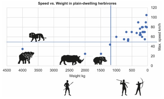 Megaherbivores do not rely on escape as a predator protection strategy, as evident by their low maximum speed compared to that of a lion (Figure 3). Unlike ungulates, megaherbivores lack specific predation risk alarm signals. When humans approach, they tend to stand still and may flee or charge when humans get closer. This behavior has several implications that make their acquisition by humans relatively energetically more profitable and technologically less complex (albeit not less courageous) than hunting smaller, fleeing prey. A common ethnographic method of hunting megaherbivores is to limit the movement in mud, a forest, or a pit, for example, and dispatch them with a thrusting spear [25,26]. Hunting faster, fleeing animals usually requires hunting from a distance by the use of more complex projectile weapons.