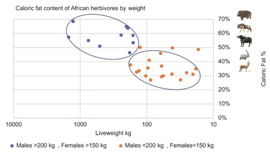 Pitts and Bullard [30] were the first to find that larger mammals contain relatively more fat than smaller animals. Our analysis of a dataset of 257 animals from 19 African herbivore species [31] confirmed this phenomenon in Table 1 and Figure 4.