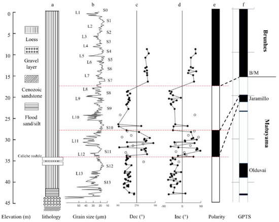 - Zhang, J.; Li, J.; Guo, B.; Ma, Z.; Li, X.; Ye, X.; Yu, H.; Liu, J.; Yang, C.; Zhang, S.; et al. Magnetostratigraphic age and monsoonal evolution recorded by the thickest Quaternary loess deposit of the Lanzhou region, western Chinese Loess Plateau. Quat. Sci. Rev. 2016, 139, 17–29. [Google Scholar] [CrossRef]