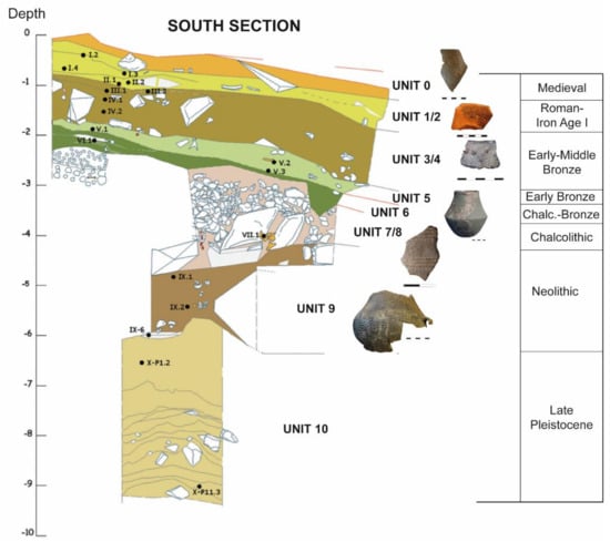 The currently known stratigraphic sequence of El Portalón exceeds 10 m and is divided into 11 stratigraphic units grouped into two sedimentary units (Figure 2). There is a basal sedimentary unit from the Upper Pleistocene with abundant microfauna [32]; however, evidence of macrofauna and human presence is scarce. The second sedimentary unit comprises the Holocene and is divided into ten stratigraphic units [26]. The cultural affiliation of the Holocene units based on the material records and supported by a large radio-chronological set provide evidence for occupations in the Middle Ages (9th–12th Centuries CE), the Roman Age (2nd Century BCE to 2nd Century CE), the Iron Age I (2360–2740 yr cal BP), Bronze Age (2876–4250 yr cal BP), Chalcolithic (4100–5572 yr cal BP) and Neolithic (5745–7270 yr cal BP) [26].