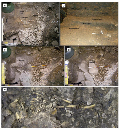 Different archaeological contexts of the Chalcolithic levels of El Portalón de Cueva Mayor site: (a) General view during the excavation of a prepared floor and active soils from the stabling phase. Note the overlapping disposition of these units in relation to the limestone blocks of the funerary tumulus from the previous phase; (b) detailed view of the alternation of prepared clay floors (orange) and active soils (dark) from the habitat/stabling context; (c) partially excavated white ash layer (fumier) covering the funerary tumulus; (d) general view of the funerary tumulus; note the basal large limestone blocks which originated from a collapse of the cave roof; (e) an example of the human remains contained in the funerary tumulus corresponding to an intact burial of a 6-year-old child.