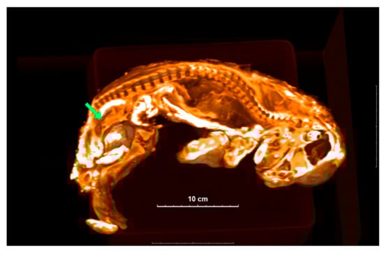 The lion cub Sparta was lying on the right side (Figure 6a), with its body flattened in a lateral-to-medial direction. The hind limbs (at the level of a distal end of the tibia) and tail appear to have suffered the most pressure as these are the most flattened parts of the body. The skull is slightly deformed, the mouth opened, and forelimbs are bent at the joints in the elbows and wrists. Hind limbs and the tail are straightened and are parallel to each other. The stomach is sucked in, most likely from the dehydration of the internal organs and muscles. The eyes are closed.