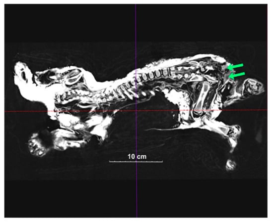 Visual observation of Boris’s body showed that it was damaged in some parts. A patch of skin is separated near the nose, and the distal part of the tail is missing. However, we were unable to check the condition of the skin of the cave lion cubs thoroughly by eye because of their thick coat fur. We, therefore, examined Sparta’s skin using computed tomography (Figure 8a). There are no visible skin injuries, but the skin is very mummified. There are a lot of unnatural wrinkles and deformations on the skin. The ears are flattened in the direction of the muzzle.