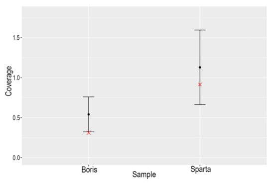 Plot of the coverage of the X chromosome (red ‘✕’) for Boris and Sparta versus two standard deviations of the coverage of the autosomes for each individual.