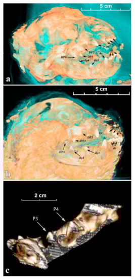 The tomographic images of cave lion cubs’ skulls and mandibles with marked deciduous teeth: (a) Sparta’s skull; (b) Boris’s skull; (c) Sparta’s mandible.