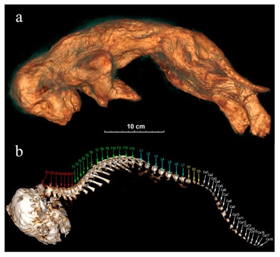 The tomographic images of Sparta’s body from the left side: (a) skin; (b) skull and spine. The spinal bones: C—cervical vertebrae, T—thoracic vertebrae, L—lumbar vertebrae, S—sacral vertebrae, Ca—caudal vertebrae.
