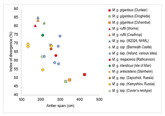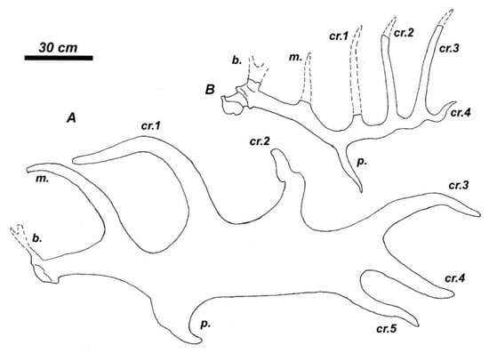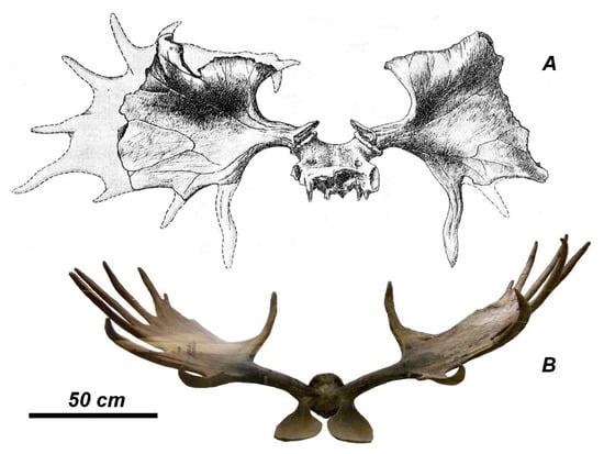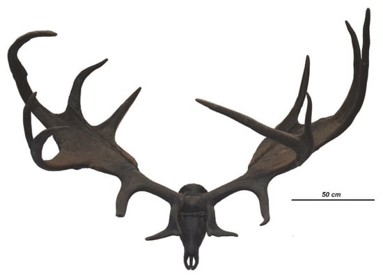 Giant deer Megaloceros giganteus (Blumenbach, 1799) is one of the iconic fossil species best known to the general public with the longest research history covering more than three centuries. The first scientific report on giant deer was published by Molyneux in 1697 [1] and since then a large number of studies has been dedicated to this remarkable species. Giant deer males grow astonishing large antlers, which are absolutely and relatively largest among fossil and modern deer and represent the most attention-grabbing and intriguing evolutionary specialization of the giant deer. The extremely large antlers of M. giganteus aroused a long-lasting debate on the origin of such an “inadaptive” feature and its contribution to the species’ extinction [2]. The giant deer was cited by supporters of the now-abandoned theory of orthogenesis as an example of excessive and harmful development of antlers that caused the extinction of their bearers (the so-called “antler-extinction hypotheses” [3,4]).