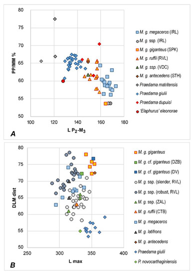 In most cases, the evolutionary, ecomorphological, and paleobiologic studies of the giant deer are based on the exceptionally rich sample from Ireland [8,9,11,16,17], a circumstance that may be regarded as a weak point, since the results obtained and proposed hypotheses have remained outside the systematical and evolutionary context of M. giganteus and the important and major part of the information on giant deer ecomorphology and paleoecological diversity has been overlooked. Despite the very early reports on various forms of “continental” giant deer [18], they remain disregarded in paleoecological and evolutionary studies. Such a “restricted” approach has been caused by the unresolved taxonomic issues and a very broad and confusing understanding of the genus Megaloceros during the 20th century that included all Pleistocene continental large-sized deer and many dwarf insular forms [19,20].