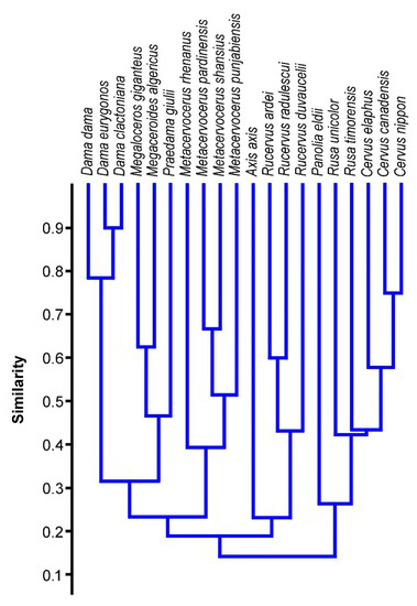 A multivariate cluster analysis of the diagnostic cranial, dental, and antler characters is applied to find support for the systematic position of the giant deer and related forms. The hierarchical clustering paired group algorithm UPGMA was computed using the Jaccard Similarity Index for presence–absence data (PAST-4.03 application [35]). The cophenetic correlation coefficient is computed to estimate how faithfully a dendrogram preserves the pairwise distances among the original, unmodelled data points [36]. The craniodental and the antler characteristics considered in the multivariate analysis are adapted with some modifications and additions from Croitor and Robinson [37] and Croitor et al. [38]. The classification of advanced and primitive conditions for the characters used in the cluster analysis is adapted from Vislobokova [23]. The following morphological characters were considered in the multivariate analysis: