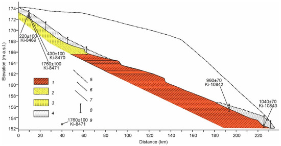 Radiocarbon dating of sediments was performed in several different laboratories with the following indices: MGU—Moscow State University, Moscow, Russia (closed); IGAN—Institute of Geography RAS, Moscow, Russia; Ki—Institute of Radio-Geochemistry of the Environment, Kyiv, Ukraine. Information on the laboratories is available at [18]. Some of the 14C dates used in the current paper were published in [19], Table 3.