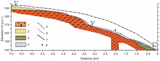 In this uppermost stretch of the balka, the glaciofluvial or glaciolacustrine sands and silts are found (Figure 12A, cross-section P-1). In the lowermost part of the Cholokhovskaya Balka (Figure 12C, cross-section P-3), the coring revealed ancient lacustrine and alluvial deposits 2–3 m thick covered with Holocene alluvia. According to palynological data, these deposits were accumulated during the Last Interglacial (MIS 5e) [33].