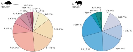 Pie chart representing the preservation for Oryzomyini (A) and Dasyprocta (B) mandibles according to the number of available landmarks (from 2 to 13). See Table S2 for the number of Oryzomyini and Dasyprocta specimens (NISP) for each digitalized landmark.