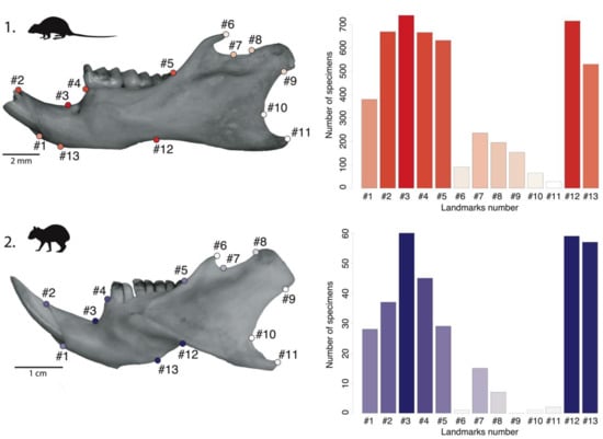 (Left) Protocols for positioning the landmarks for the Oryzomyini (1) and for the Dasyprocta (2) colored according to the values of the histogram (Right) representing the number of mandibles on which each type of landmark was measured (Oryzomyini NISP = 767, Dasyprocta NISP = 66). (See Table S3 for the landmark descriptions).