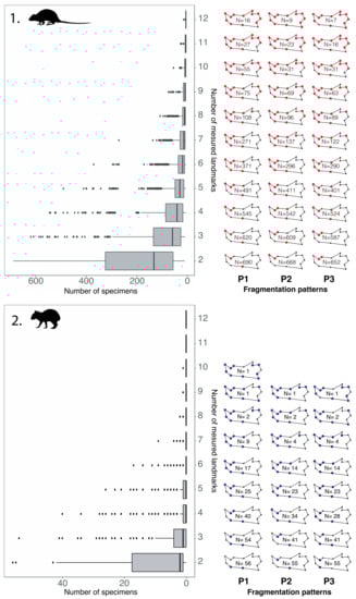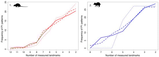 For each number of measured landmarks (from 2 to 13 for rice rats and from 2 to 10 for agoutis) the three most frequent patterns were identified and visualized (categories P1 to P3, Figure 3). Not surprisingly, the smaller the number of landmarks measured the greater the number of fragments available. On the mandibular corpus, up to 7 landmarks can be digitized, which corresponds to the majority of quantified fragments.