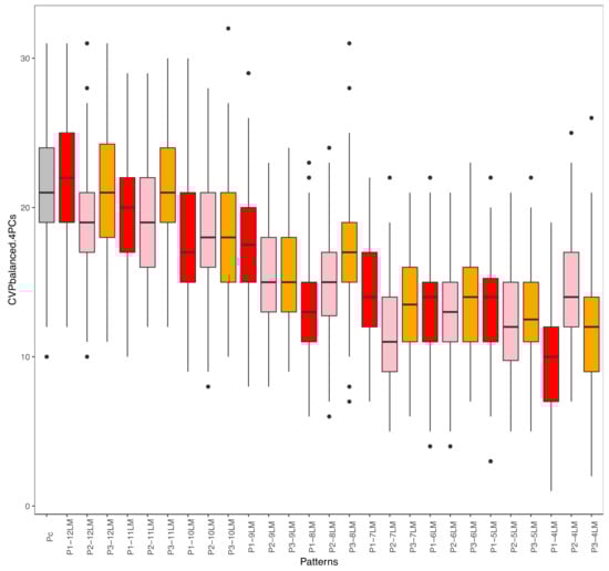 Boxplot representing the distribution of cross-validation percentages (CVP) for 4 PCs of each pattern (between 4 and 12 landmarks), according to the genus of attribution of specimens from the reference collections. Grey: Pc: complete protocol, Red: P1: category of the first most frequent fragmentation patterns with N landmarks, Pink: P2: second category, Orange: P3: third category.