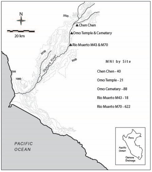 Originating from a homeland in the Bolivian altiplano at over 3800 masl near Lake Titicaca, Tiwanaku colonists traveled over 250 km and settled in the mid-valley desert oasis of the Osmore drainage beginning in the 7th century AD. In contrast to the Huari, who settled the high sierra of the valley, the Tiwanaku occupied the highly productive middle Moquegua valley where their occupation was concentrated in four large cosmopolitan townsites at Omo, Chen Chen/Los Cerrillos, Rio Muerto, and Cerro Echenique (Figure 1). The Tiwanaku colonies thrived for over four centuries as evidenced by their construction of large towns, a sunken court temple, massive field and canal systems, geoglyphs, and extensive cemeteries [,]. At the height of settlement, the colony supported populations between 8000 and 20,000 people. Residents practiced intensive agriculture and produced crops amenable to the mid-valley setting, such as maize and legumes []. People transported locally produced foodstuffs to their highland homeland via llama caravans []. The demise of the Tiwanaku colony began around 1000 CE. At that time, the population dispersed into smaller settlements and none of the subsequent cultural groups reoccupied the original Tiwanaku townsites in the valley.