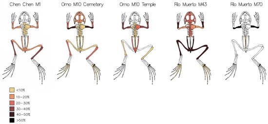 Frog and toad remains are most common in cemeteries and tombs. At the Rio Muerto M70B cemetery, 23 of the 27 analyzed tomb contexts yielded 352 anuran individuals (see Table 1 and Table 5) resulting in an anuran ubiquity index of 85.2%. At Omo M10, 26 of the 65 studied tomb contexts produced an MNI of 85 anuran individuals (40.0% ubiquity index). The assemblage from Rio Muerto M43 included eight individuals collected from eight tombs, while the other 34 tombs excavated did not yield any anuran bones indicating a ubiquity index of 23.5%. Similarly, the assemblage from Chen Chen cemeteries yields 30 individuals from 12 tombs out of a total of 36 analyzed tombs (ubiquity index of 33.3%). The contrast between M43 and M70B is notable, considering that both cemeteries are located at a similar elevation but M43 is slightly closer to water sources where frogs would naturally occur.