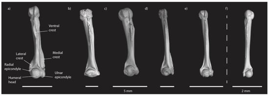 Humeri of anuran species used for comparison with fossil material. (a) Telmatobius carrillae; (b) Rhinella marina; (c) Pleurodema nebulosa; (d) Hyla boans; (e) Gastrotheca nebulanastes; (f) Psychrophrynella bagrecito. (a–e) Right humerus, scale bar = 5 mm; (f) left humerus, scale bar = 2 mm. [] (Anatomical nomenclature). Composite image by Vallejo-Pareja from photographs of digitally segmented specimens (ct-scans) at the Herpetology Division of the Florida Museum of Natural History.
