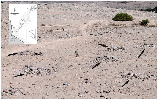 The Rio Muerto complex located at 1025 masl, is the third-largest Tiwanaku settlement in Moquegua [] (p. 149). Unlike Omo, Rio Muerto is not on a blufftop, but is located in a dry gulch tributary just outside of, but only slightly higher than, the canal-irrigated valley. Rio Muerto includes two sites, M43 (6.7 ha), which is closest to the modern canal, and M70 (2.8 ha), which is further removed from the valley bottom. At M70, the small cemetery M70B, located northwest of the domestic sector M70A, is of greatest interest to this study. The M70B cemetery is unique for our sample and unusual for the Moquegua Tiwanaku culture because the approximately 90 tombs are located under or within a massive rockpile up to 1m in height of loosely stacked stones (Figure 2) []. Excavators recovered anuran remains in deposits above the intact tombs. Anuran remains were not in direct association with the burials themselves, indicating that they are not offerings.