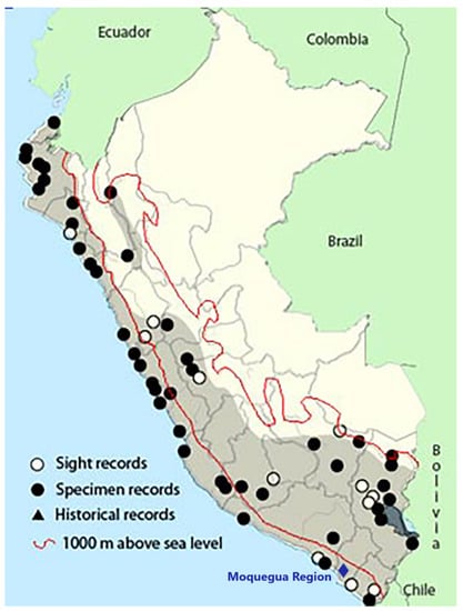 - Schulenberg, T.S.; Stotz, D.F.; Rico, L. Distribution Maps of the Birds of Peru, Version 1.0. Environment, Culture & Conservation (ECCo). Available online: http://fm2.fieldmuseum.org/uw_test/birdsofperu/ (accessed on 4 June 2021).